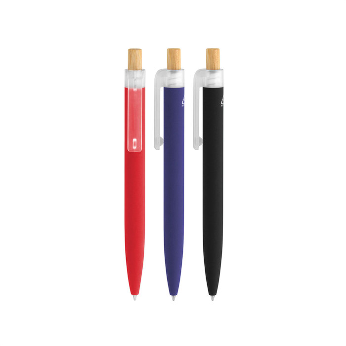 Bolígrafo retráctil. Cuerpo de aluminio en diferentes colores, acabado mate engomado, muy suave al tacto. Botón pulsador de bambú. Clip plástico transparente con terminación frosty.