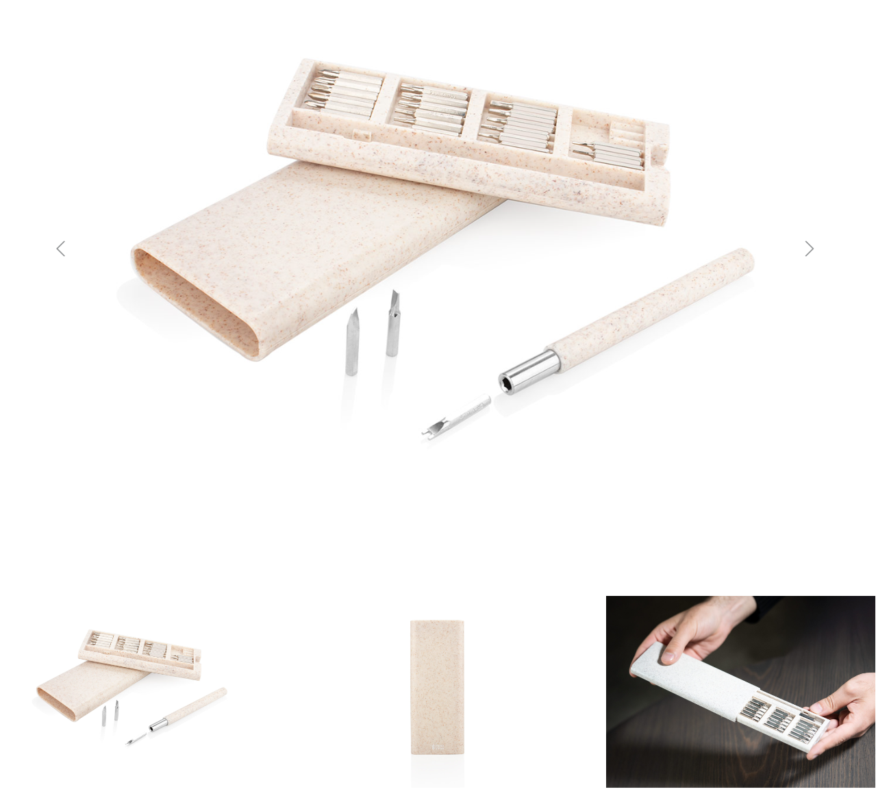 Juego de destornilladores empacado en carcasa de paja de trigo, consta de 24 piezas con tamaños para las diferentes necesidades.