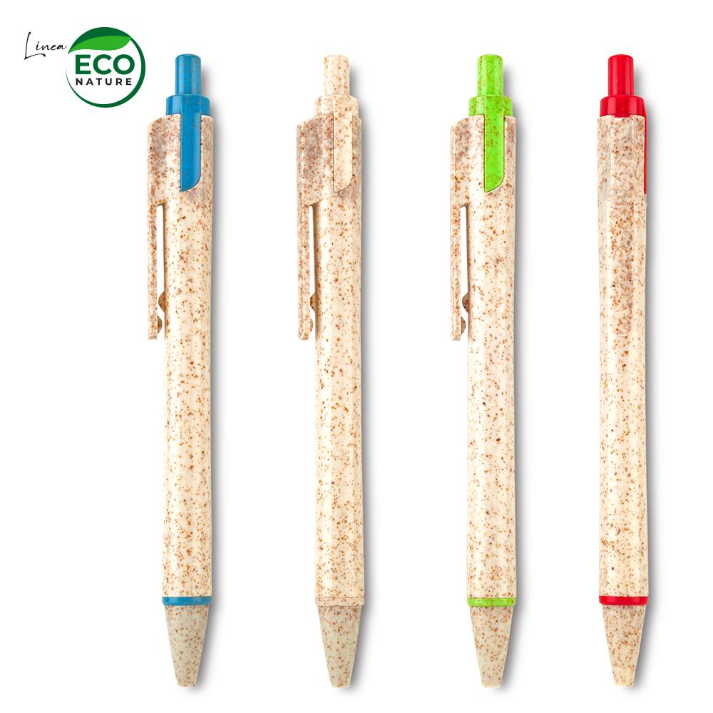 Bolígrafo plástico. Mecanismo push. Mezcla con material ecológico en fibra de trigo (50%-60% aprox). El porcentaje de material ecológico tiene un promedio de biodegradabilidad de 2-3 años después del fin de su vida útil.
