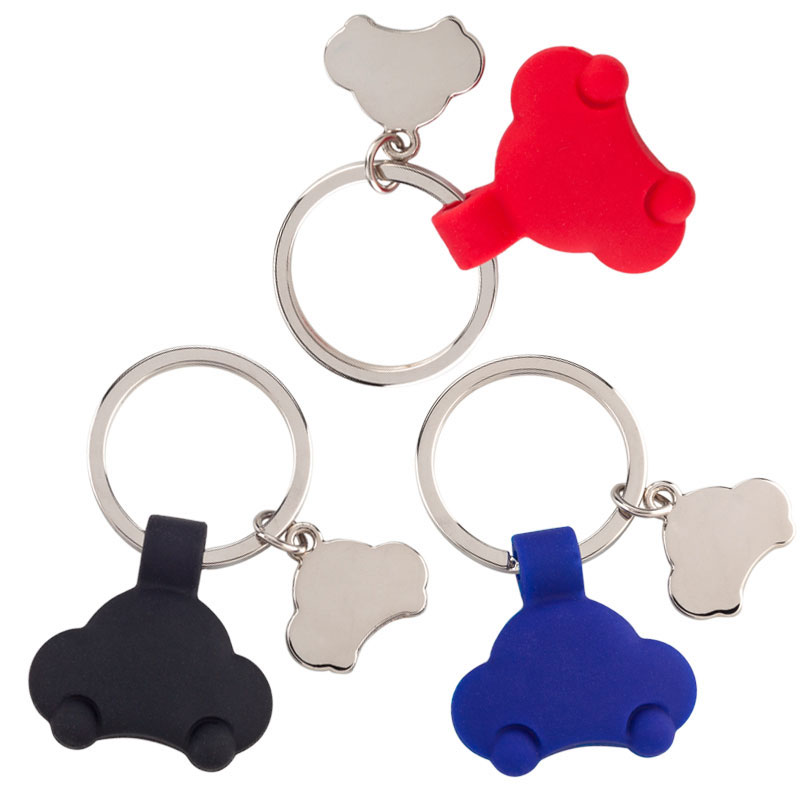 Llavero en silicona con sombra metálica en forma de carro Colores: Azul / Negro / Rojo Medidas: 3 5 cm X 6 5 cm área de marca Tampografía: 2 cm área de marca Láser: 1 3 cm Técnica de marca: Tampografía sobre silicona / Láser