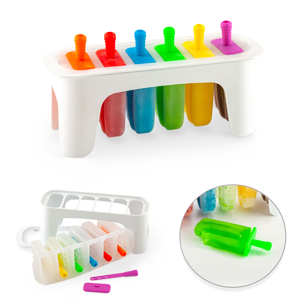 Molde de plástico y silicona para paletas. Con 6 unidades. Empaque caja individual.