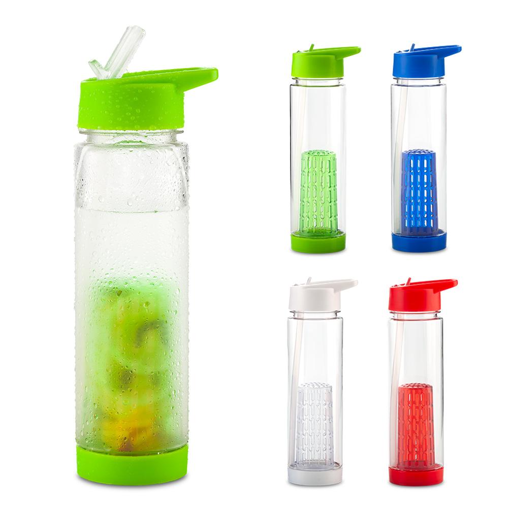 Botilito en Tritán de alta resistencia y durabilidad. Tapa rosca y pitillo. Libre de BPA (bisphenol-A). Con infusor para frutas en la parte inferior y pitillo.