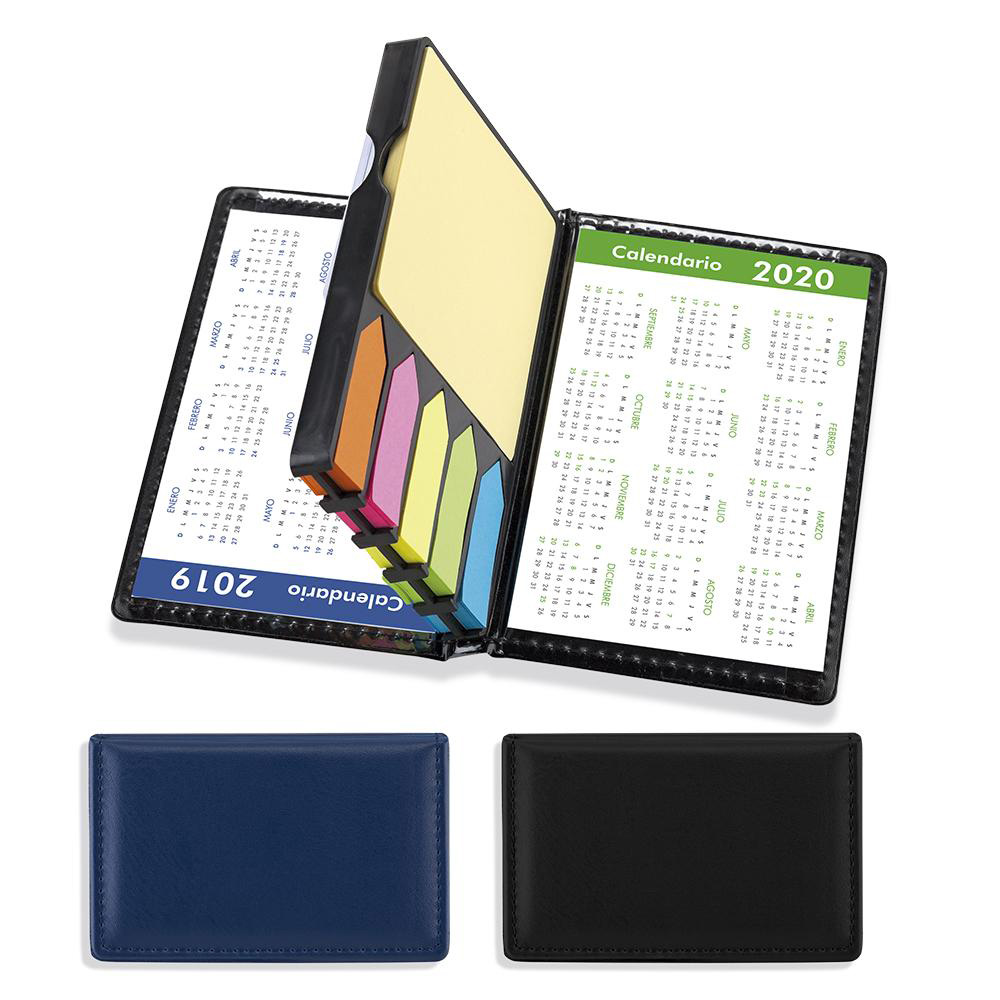 Portastickies doble en PVC. Calendario, con 2 tacos de papel autoadhesivo, Set de 5 stickies de colores. Empaque caja Individual.