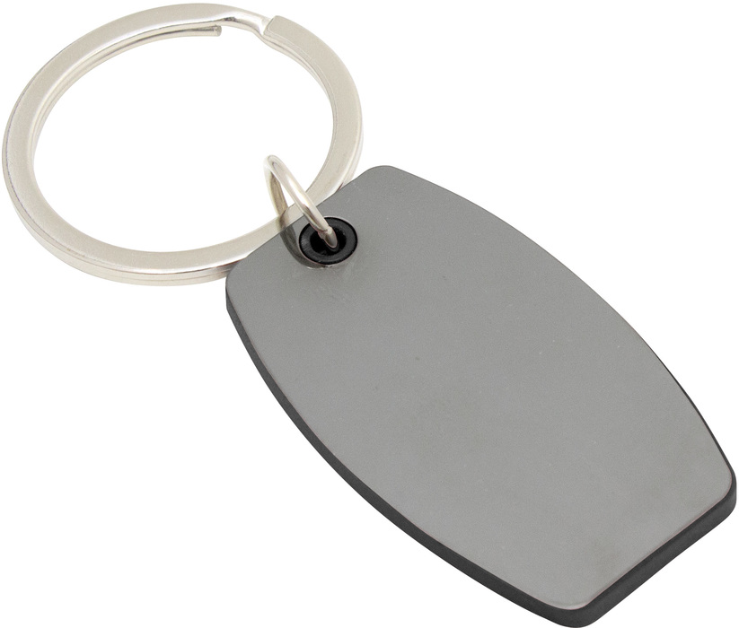 Llavero con forma ovalada. Estructura plástica de color con apliques de acero color gris gun de cada lado. Acabado brillante.