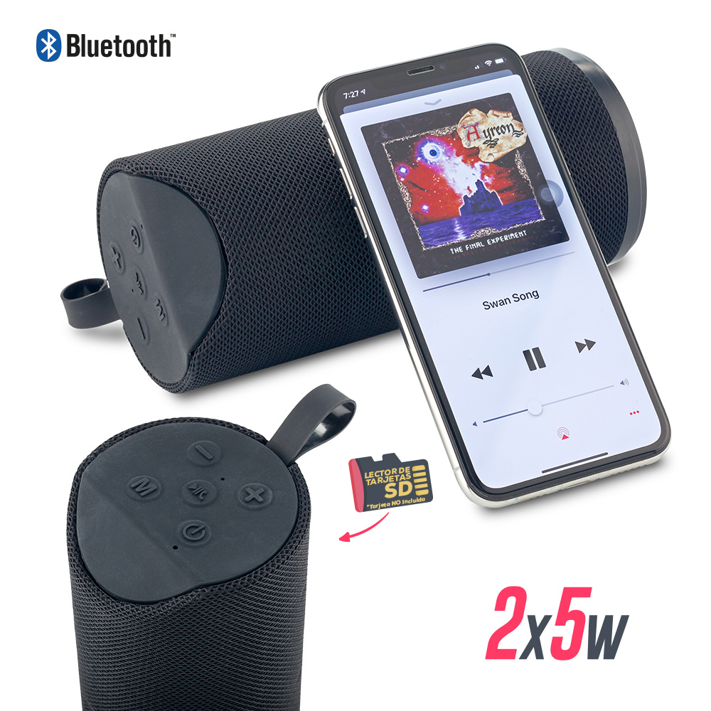 Speaker bluetooth plástico con acabado caucho, 2x5W, funciona como manos libres. Lector de tarjeta SD y USB (no incluidas), cable AUX. Empaque caja individual.