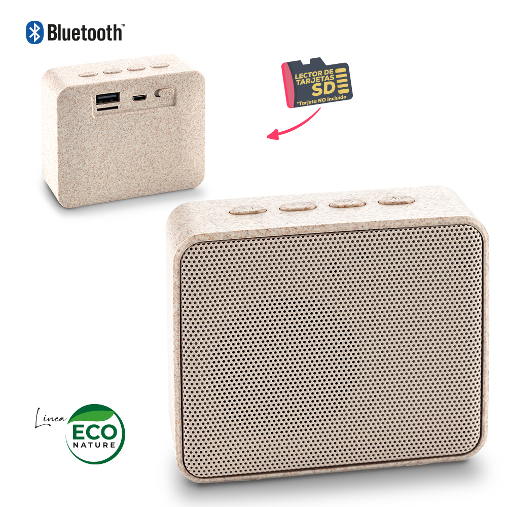 Speaker bluetooth plástico con material ecológico de fibra de trigo. 1x3W. Lector de tarjeta SD y puerto USB (no incluidas), funciona como manos libres. Empaque Caja Individual.