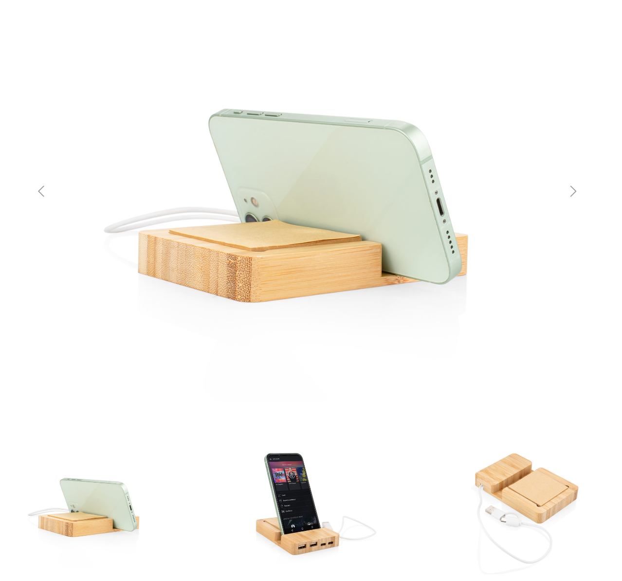 Multipuerto de bambú con soporte para teléfono y notas adhesivas. 2 entradas Tipo C, 2 entradas USB. 1 salida tipo C o USB.