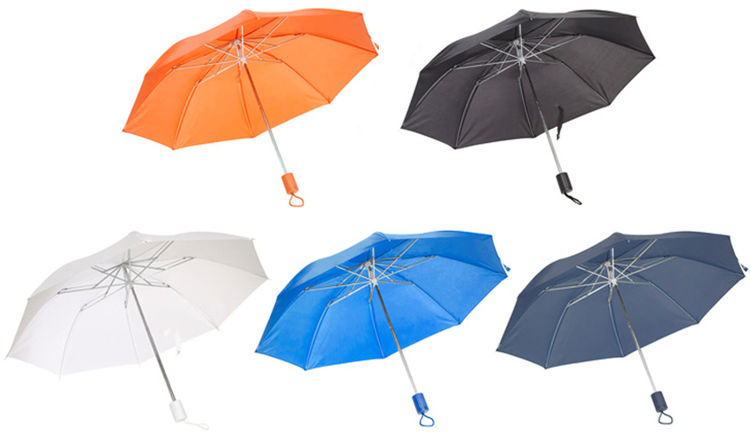 Ø 90 cm. Cerrado 32 cm. Poliéster.Extendido 50 cm. Estructura metálica 8 varillas. Plegable en tres partes. Mango plástico con cordón. Funda. APERTURA Y CIERRE MANUAL